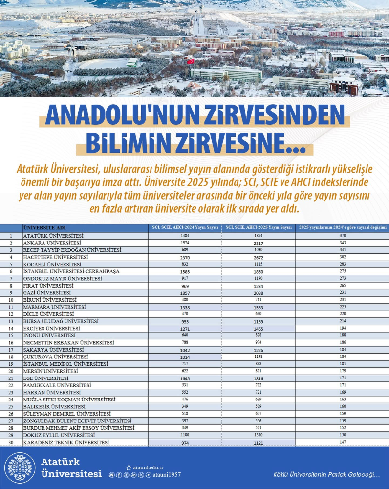 • Atatürk Üniversitesi, uluslararası bilimsel yayın performansındaki istikrarlı yükselişiyle önemli bir başarıya daha imza attı. 📌