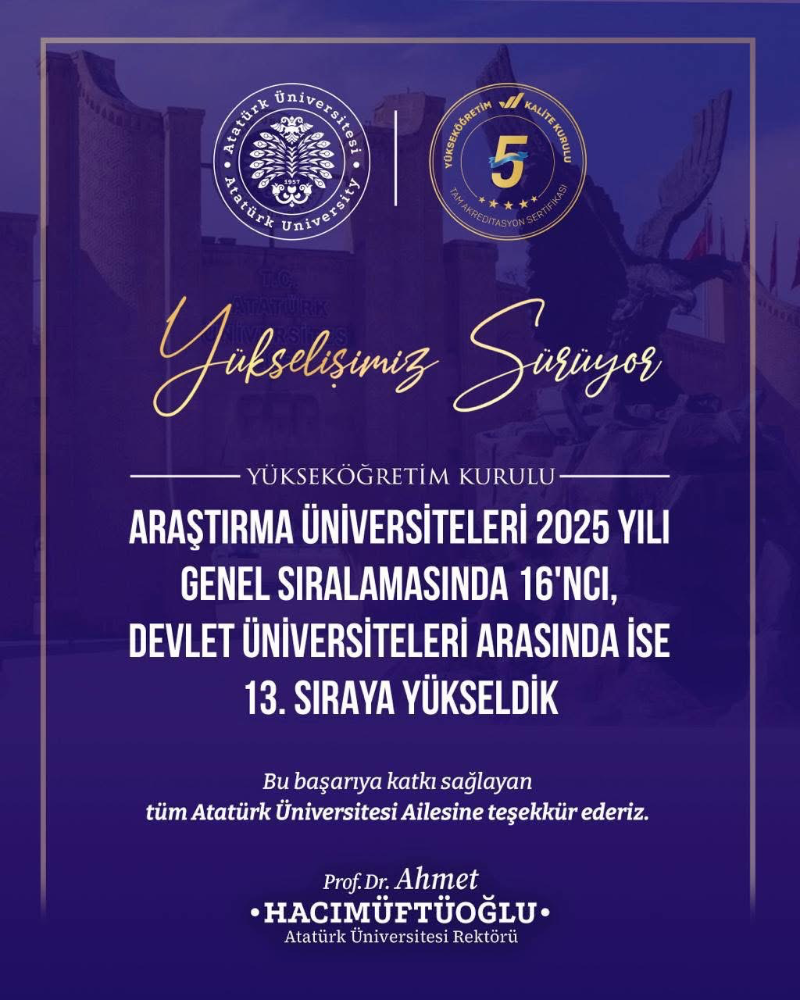 Atatürk Ünİversİtesİ Yükselerek 16. Sıraya Yerleştİ!Atatürk Üniversitesi, YÖK’ün 2025 Araştırma Üniversiteleri değerlendirmesinde bir basamak yükselerek 16’ncı sıraya çıktı. Ar-Ge fonları, patentler ve uluslararası başarı göstergelerinde güçlü artış dikkat çekti.