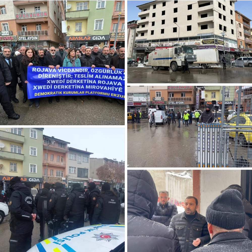 Doğunun Gürsesi /Erzurum’da DEM Parti’nin Rojava yürüyüşü talebi güvenlik gerekçesiyle polis tarafından engellendi. Provokasyona izin verilmezken, yapılan görüşmelerin ardından yalnızca parti binası önünde basın açıklamasına müsaade edildi. Açıklama yoğun güvenlik önlemleri altında olaysız şekilde tamamlandı.