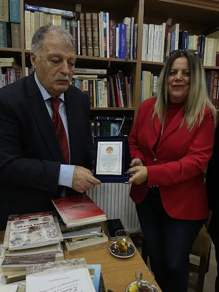 Program kapsamında Prof. Dr. Erol Kürkçüoğlu’na plaket takdim edilirken, ziyaretin sonunda Kürkçüoğlu, Ermeni mezalimini konu alan eserlerinden birini Gamze İspirli’ye hediye etti. Anlamlı buluşma, hatıra fotoğrafı çekimiyle sona erdi.