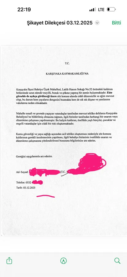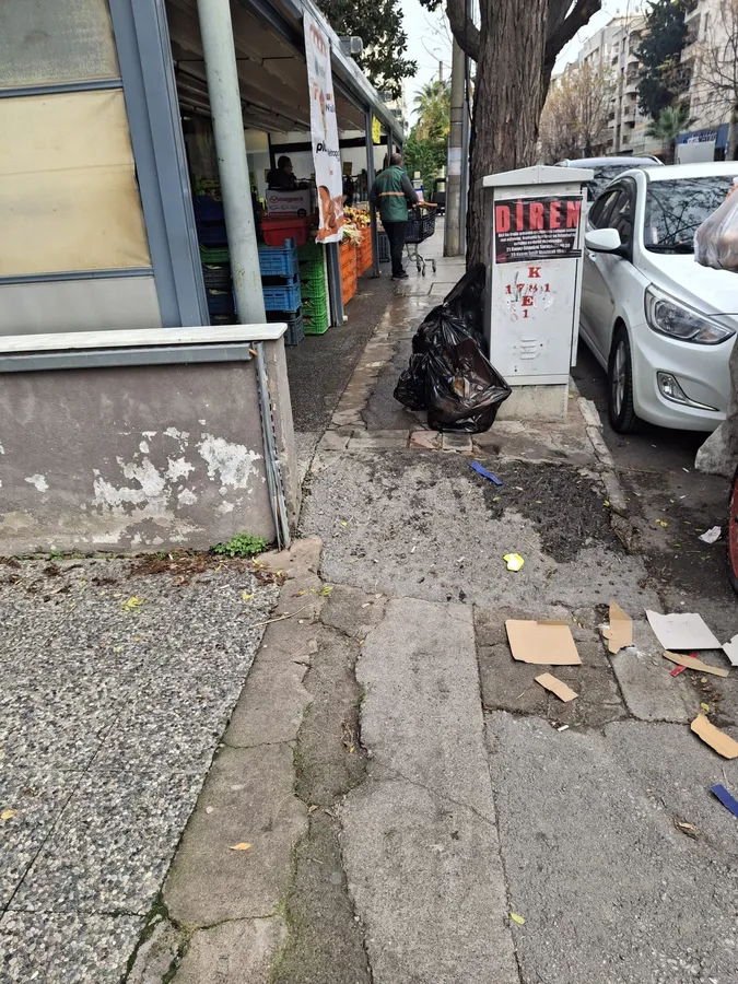 Bahriye Üçok Mahallesi Latife Hanım Sokağı’nda bulunan ve uzun süredir çökme ve eğim bozukluğu nedeniyle risk oluşturan kaldırımda, geçtiğimiz günlerde bir vatandaş düşerek kuyruk sokumu kırığıyla yaralandı. Yaralanan vatandaş, durumu Karşıyaka Kaymakamlığı’na bildirdi. Kaymakamlık, olayın ardından hemen Karşıyaka Belediyesi’ne resmî yazı göndererek söz konusu kaldırımın onarılmasını talep etti. Ancak, aradan geçen süreye rağmen, kaldırımda herhangi bir onarım ya da güvenlik önlemi alınmadı.