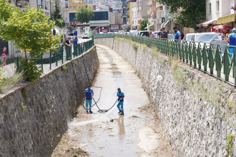 Dere yatağını tazyikli su ile yıkayan ekipler, kanalda kapsamlı bir temizlik çalışması gerçekleştirdi.