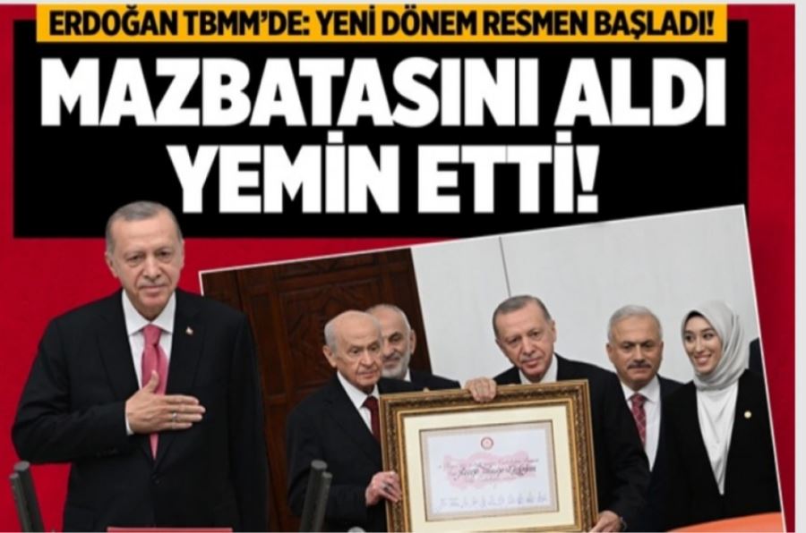 Cumhurbaşkanı Erdoğan, Bahçeli'den mazbatasını aldı ve yemin etti. Böylece Erdoğan'ın yeni dönemi resmen başladı. Erdoğan, Genel Kurul'da düzenlenen yemin töreni için geldiği Meclis'te ilk olarak çiçeklerle ve törenle karşılandı. Yemin töreninin ardından Erdoğan, Anıtkabir'i ziyaret etti ve Anıtkabir özel defterini imzaladı.Seçimde bir kez daha cumhurbaşkanı seçilen Recep Tayyip Erdoğan'ın 2028'e kadar sürdüreceği görevi resmen başladı. Erdoğan, bugün ilk olarak TBMM'de yemin törenine iştirak etti. Genel Kurul, Geçici TBMM Başkanı, MHP Genel Başkanı ve Osmaniye Milletvekili Devlet Bahçeli başkanlığında açıldı.Erdoğan, mazbatasını TBMM Geçici Başkanı Devlet Bahçeli'den aldı ve Meclis'te yemin etti.Erdoğan, yemin töreninin ardından TBMM'den ayrıldı. Saat 16.00'da Anıtkabir'i ziyaret eden Erdoğan, 18.00'de Cumhurbaşkanlığı Külliyesi'ndeki "Göreve Başlama Töreni"ne katılacak.CUMHURBAŞKANI YEMİNİ"Cumhurbaşkanı sıfatıyla devletin varlığı ve bağımsızlığını, vatanın ve milletin bölünmez bütünlüğünü, milletin kayıtsız ve şartsız egemenliğini koruyacağıma, Anayasa'ya, hukukun üstünlüğüne, demokrasiye, Atatürk ilke ve inkılaplarına ve laik Cumhuriyet ilkesine bağlı kalacağıma, milletin huzur ve refahı, milli dayanışma ve adalet anlayışı içinde herkesin insan haklarından ve temel hürriyetlerinden yararlanması ülküsünden ayrılmayacağıma, Türkiye Cumhuriyetinin şan ve şerefini korumak, yüceltmek ve üzerime aldığım görevi tarafsızlıkla yerine getirmek için bütün gücümle çalışacağıma Büyük Türk milleti ve tarih huzurunda, namusum ve şerefim üzerine ant içerim."Dünya liderlerinin de aralarında bulunduğu yabancı konuklar da Cumhurbaşkanı Erdoğan'ın göreve başlama törenine katılmak üzere Ankara'ya gelmeye başladı.CUMHURBAŞKANI ERDOĞAN, ANITKABİR'DEYemin töreninin ardından Erdoğan, Anıtkabir'i ziyaret etti.Anıtkabir özel defterini imzalayan Cumhurbaşkanı Erdoğan şu ifadeleri kullandı:"Aziz Atatürk Türkiye bir seçim sürecini daha tüm dünyaya örnek gösterilecek rekor bir katılımla ve demokrasi şöleni havasında suhuletle neticelendirdi. 14 Mayıs’ta TBMM’nde görev yapacak 28. dönem milletvekillerini belirleyen milletimiz 28 Mayıs’ta gerçekleştirilen Cumhurbaşkanı seçiminin şahsımıza yüzde 52,18 oy oranı ile yine büyük bir teveccüh gösterdi. Hamdolsun bir 5 sene daha ülkemize ve necip milletimize hizmet edecek olmanın bahtiyarlığını yaşıyoruz.Cumhurbaşkanlığı hükümet sisteminin de güvenoyu aldığı bu seçimlerin milletimizin önünde yeni bir dönemin kapılarını açtığına inanıyoruz. Önümüzdeki 5 yıl boyunca Türkiye’nin Yüzyılı vizyonunu hayata geçirmek için canla başla çalışmayı sürdüreceğiz. Asrın felaketi 6 Şubat felaketinin yaralarını hızla sarıp söz verdiğimiz gibi depremzedelerimizi en kısa sürede yeni yuvalarına kavuşturacağız. 12. cumhurbaşkanı olarak milletimizin ebedi ve ezeli kardeşliğini korumaya ülkemizi büyütmeye devletimizi yüceltmeye devam edeceğiz. Rabbim yolumuzu bahtımızı açık etsin. Ruhun şad olsun."ERDOĞAN'IN MECLİS'E GEÇTİĞİ ANLARCumhurbaşkanı Erdoğan'ın, Genel Kurul’da düzenlenecek yemin töreni için Cumhurbaşkanlığı Külliyesi’nden TBMM’ye intikal ettiği anlarErdoğan, Meclis'te çiçeklerle ve törenle karşılandıÖNCE ANITKABİR’E SONRA KÜLLİYE’YE GEÇECEKErdoğan Cumhurbaşkanlığı yemininin ardından Anıtkabir’e gittikten sonra da atlı birlikler eşliğinde Cumhurbaşkanlığı Külliyesi’ne gidecek. Göreve başlama töreni ise Külliye’de gerçekleştirilecek.101 PARE TOP ATIŞI YAPILACAKCumhurbaşkanlığı Külliyesi A Kapısı'na varışta Erdoğan'ın konvoyuna Atlı Tören Birliği katılacak. Erdoğan'ın süvari birliğiyle Külliye'ye girişi sırasında 101 pare top atışı yapılacak. Ayrıca Hava, Kara ve Deniz Kuvvetleri komutanlıklarına bağlı ordu karargahlarında da 101'er pare top atışı gerçekleştirilecek. Törende, Cumhurbaşkanlığı Senfoni Orkestrası, Cumhurbaşkanlığı Devlet Klasik Türk Müziği Korosu, Türk Silahlı Kuvvetleri (TSK) Armoni Mızıkası, TSK Mehteran Takımı ile TSK Tarihi Birlik de yöresel kıyafetleriyle hazır bulunacak.ÇANKAYA KÖŞKÜ'NDE AKŞAM YEMEĞİTörene katılacak 21 devlet başkanı şöyle sıralanıyor:Azerbaycan Cumhurbaşkanı İlham Aliyev, Venezuela Devlet Başkanı Nicolas Maduro, Bulgaristan Cumhurbaşkanı Rumen Radev, Gabon Cumhurbaşkanı Ali Bongo Ondimba, Gine Bissau Cumhurbaşkanı Umaro Sissoco Embalo, Güney Afrika Cumhurbaşkanı Cyril Ramaphosa, Karadağ Cumhurbaşkanı Yakov Milatoviç, Kazakistan Cumhurbaşkanı Kasım Cömert Tokayev, Kırgız Cumhuriyeti Cumhurbaşkanı Sadır Caparov, Kongo Cumhurbaşkanı Denis Sassou N'Guesso, Kosova Cumhurbaşkanı Vjosa Osmani, KKTC Cumhurbaşkanı Ersin Tatar, Kuzey Makedonya Cumhurbaşkanı Stevo Pendarovski, Özbekistan Cumhurbaşkanı Şevket Mirziyoyev, Ruanda Cumhurbaşkanı Paul Kagame, Senegal Cumhurbaşkanı Macky Sall, Somali Cumhurbaşkanı Hasan Şeyh Mahmud, Togo Cumhurbaşkanı Faure Essozimna Gnassingbe, Türkmenistan Devlet Başkanı Serdar Berdimuhamedov, Bangladeş Cumhurbaşkanı Muhammed Şahabuddin Çuppu, Gine Devlet Başkanı Mamady Doumbouya.Göreve başlama törenine Pakistan Başbakanı Şahbaz Şerif, Macaristan Başbakanı Victor Orban, Ermenistan Başbakanı Nikol Paşinyan ve Libya Başbakanı Abdulhamid Dibeybe'nin de aralarında bulunduğu 13 ülkenin başbakanları iştirak edecek.Törene Türk Devletleri Teşkilatı Genel Sekreteri Kubanıçbek Ömüraliyev, NATO Genel Sekreteri Jens Stoltenberg, İslam İşbirliği Teşkilatı Genel Sekreteri Hüseyin İbrahim Taha'nın da olduğu 8 uluslararası kuruluşun temsilcileri de katılacak.Rusya Federasyonu Devlet Duması Başkan