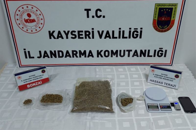 Kayseri Jandarma Komutanlığı KOM Şube Müdürlüğü ve Kocasinan İlçe Jandarma Komutanlığı ekiplerince uyuşturucu veya uyarıcı madde ticareti yapan şahısların yakalanmasına yönelik yapılan araştırma ve çalışmalar sonucunda elde edilen bilgiler doğrultusunda; Talas'ın Mevlana Mahallesi'nde şüpheli (L.K.) isimli şahsın ev ve aracında, Kayseri Cumhuriyet Başsavcılığı'ndan alınan arama kararı gereğince, Narkotik köpek timi eşliğinde yapılan arama neticesinde; Yaklaşık (1.021) gr. bonzai uyuşturucu maddesi olduğu değerlendirilen madde ve 2 adet hassas terazi ele geçirildi. Şüpheli gözaltına alındı.