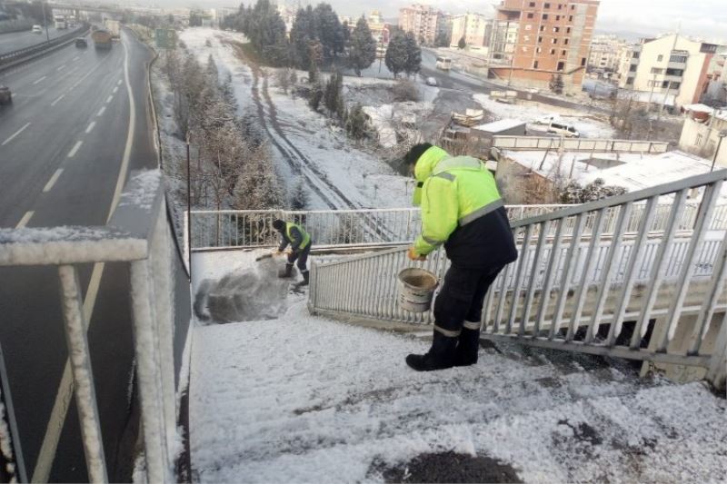 İl genelinde buzlanmaya karşı tuzlama çalışması yapan Büyükşehir ekipleri, yaya üst geçitlerinde vatandaşların güvenliği için solüsyon çalışması uyguladı.
