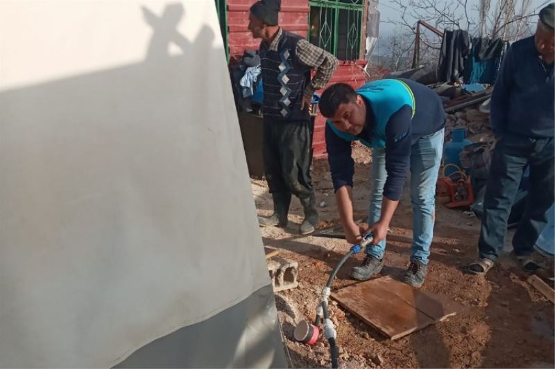 Mahallede, deprem felaketi nedeniyle su ulaşmayan evlere ve çadırlara su verilmesi için çalışan ekipler, gerekli bağlantı çalışmalarını yaparak vatandaşı temiz suya ulaştırdı.