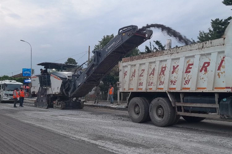 Pazaryeri Gündem / BİLECİK (İGFA) - İlçede bulunan Bahattin Şeker Caddesi ve Bursa Caddelerinde ilçedeki, Bursa karayolunda ki trafik akışının ve ilçe esnafının etkilenmemesi için çalışmalarını gece sürdüren ekipler, frezeleme ve kazıma, trimer uygulaması tamamlanan kısımlarda sıcak asfalt serilimi gerçekleştiriyor.