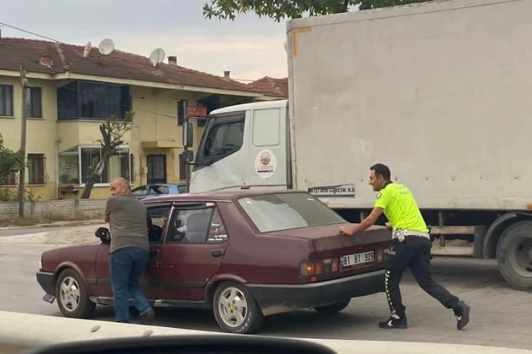 Düzce'de devriye halinde olan trafik polisi, yakıtı biten bir otomobil sürücüsünün aracını iterek akaryakıt istasyonuna ulaştırdığını görünce ekip otosundan inip vatandaşlara yardım etti.