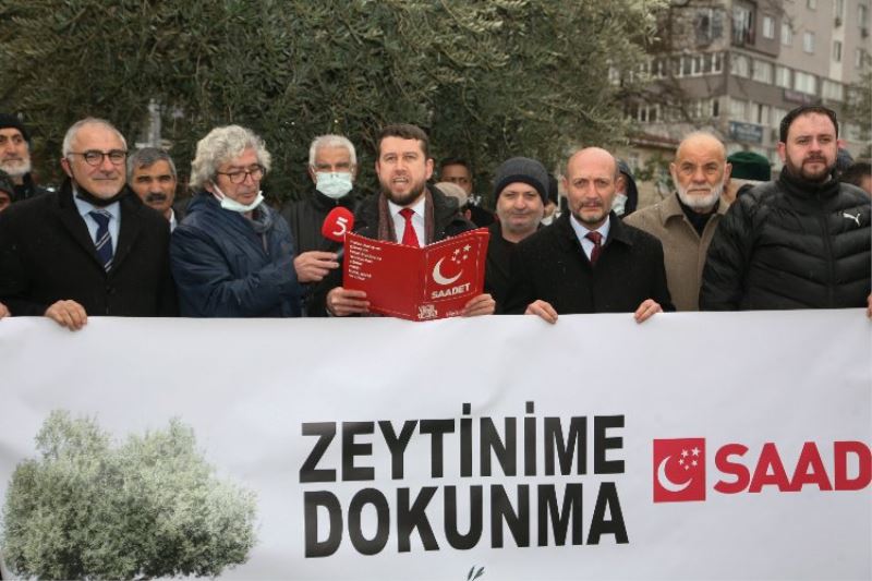 Bursa'nın Gemlik ilçesinde 'Zeytinime Dokunma' konulu basın açıklaması yapan Saadet Partililer, "Elinizi, gözünüzü, çiftçinin üzerinden, toprağından çekin artık" diye seslendi.
