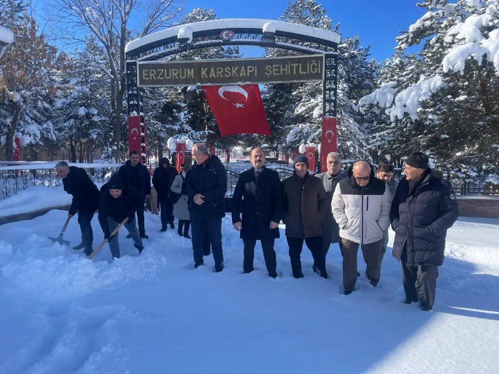 İYİ Parti Erzurum İl Başkanı Ali Öğdük, il yönetim kurulu üyeleriyle birlikte Karskapı Şehitliği’ni ziyaret ederek şehitler için dualar etti, ardından şehitlik alanında kar temizliği yaptı. E-5 Karayolu’nun hemen yanında bulunan şehitlikte, giriş kapısından itibaren biriken karları ellerine aldıkları kürek ve fırçalarla temizleyen İYİ Partililer, vatandaşların takdirini kazandı.