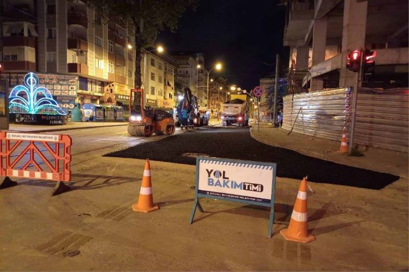 Kocaeli Büyükşehir Belediyesi ekipleri, araç trafiğine engel olmamak için çalışmalarını gece geç saatlerde yapıyor