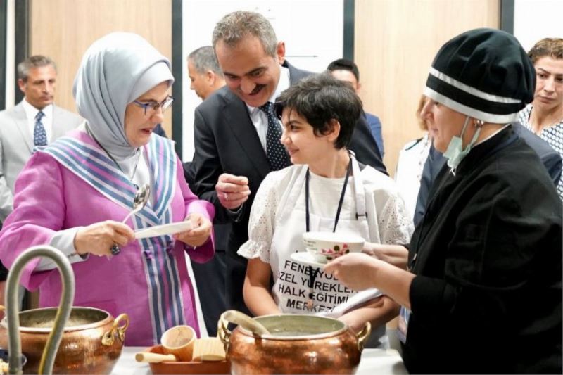 İSTANBUL (İGFA) - Özel eğitime ihtiyacı olan 18 yaş üstü yetişkin bireyler için açılan "Feneryolu Özel Yürekler Halk Eğitimi Merkezi" açılışında Erdoğan ve Özer, ilk olarak yiyecek içecek atölyesini ziyaret etti. Hafif düzey zihinsel engelli öğrencilerin şeflerinden yaptıkları çalışmalarla ilgili bilgi alan Erdoğan, sohbet ettiği öğrencilerin hazırladığı soğuk ayran aşı çorbasını tattı.